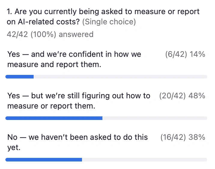 Right now, 48% of organizations say they’re being asked to measure or report on AI-related costs. The problem is that they’re still figuring out how to do it.
