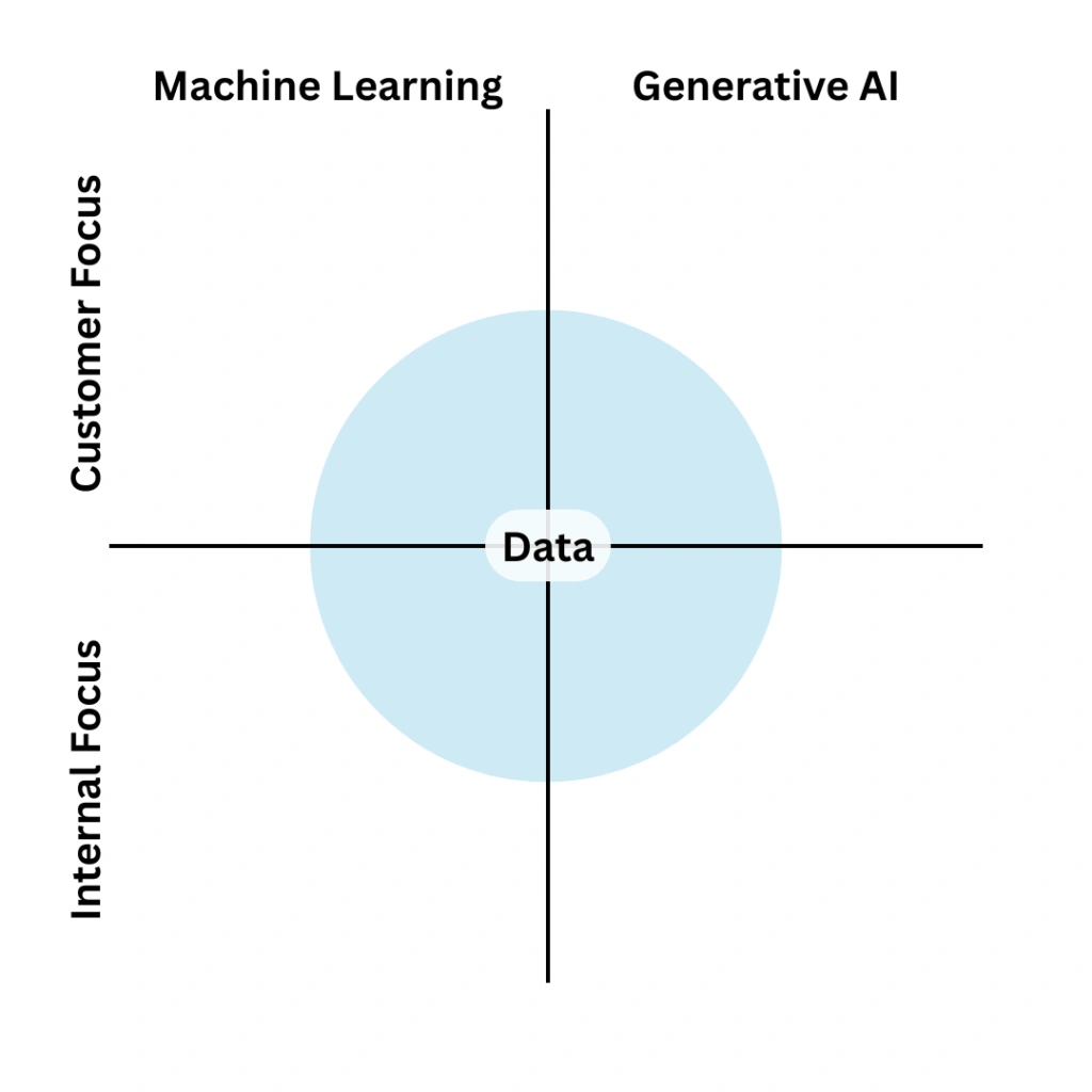 - Internal focus. Using AI to optimize some behind-the-scenes process, like understanding which customers are at risk of churning or how to get website visitors into your sales funnel. Customers aren’t using any of what you build with AI here, but there is tremendous internal business value.
