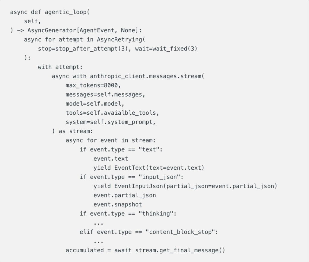 Curious about what an agentic agent loop looks like? Here’s a sample from a Reddit post describing how to build your own agent from scratch.
