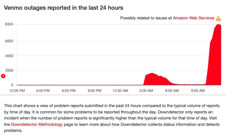 Platforms impacted included Venmo, Snapchat, Fortnite, Duolingo, airline websites, and multiple government services, with some tracking over 15,000 incident reports during the peak.