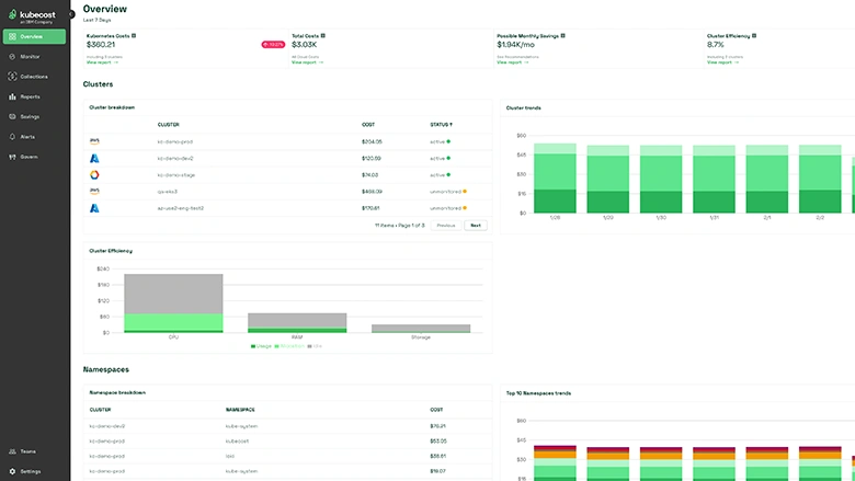 Kubecost (now IBM Kubecost) is an open-source Kubernetes cost monitoring project. It breaks down spend by namespace, deployment, pod, label, and team, integrating with Prometheus for real-time metrics and supporting cost allocation exports to external FinOps platforms.