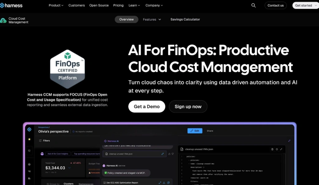 Harness Cloud Cost Management (CCM) is part of the broader Harness software delivery platform, which also covers CI/CD, feature flags, and security. That integration is its main differentiator: cost visibility lives alongside deployment pipelines, so engineers see cost signals in the same tools where they ship code.