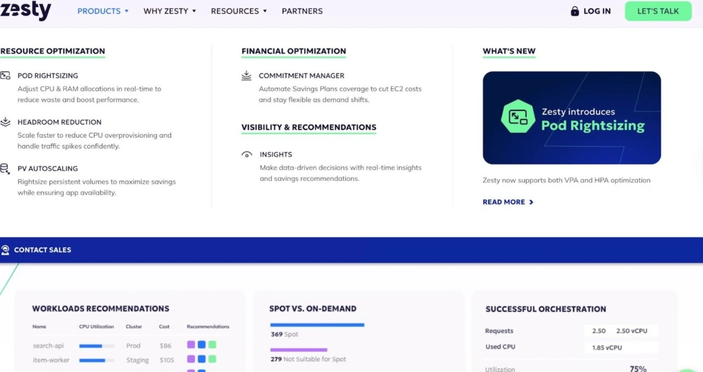 Zesty uses machine learning to eliminate cloud infrastructure waste in real time — not just surface it. Its three core products handle the main cost levers: Commitment Manager optimizes EC2 and RDS Reserved Instances and Savings Plans automatically; Zesty Disk auto-scales EBS volumes based on actual usage; and Kompass handles Kubernetes pod rightsizing, PV autoscaling, and node management.