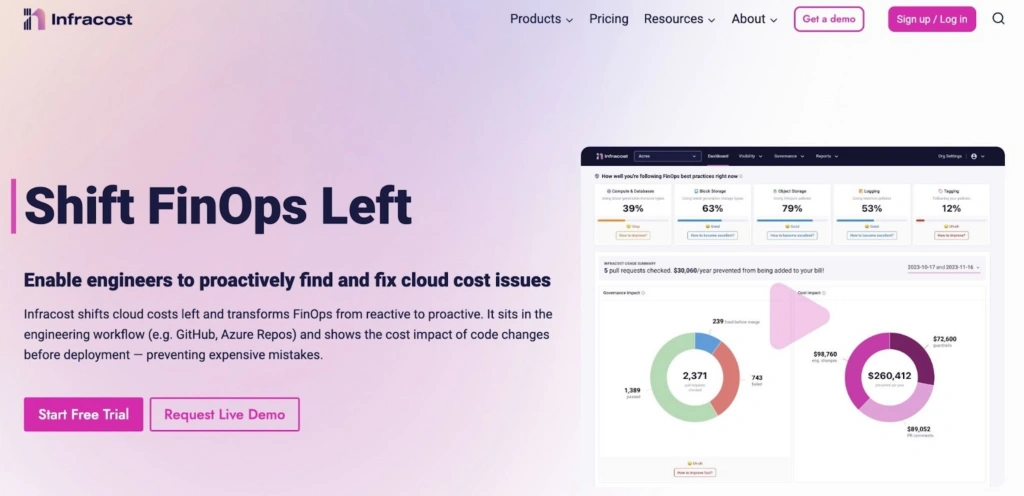 Infracost shifts cloud cost visibility left by showing engineers the cost impact of infrastructure changes before resources are launched. It integrates with Terraform and OpenTofu, running cost estimates in pull requests, VS Code, and CI/CD pipelines across AWS, Azure, and GCP. It supports over 1,100 Terraform resources.