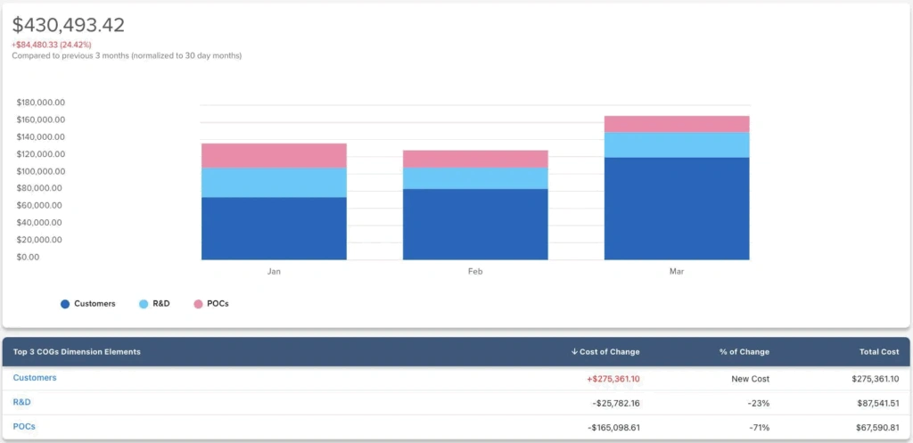 Image: This is a breakdown of a SaaS platform’s cloud spending into three main categories: POCs (the free trial as part of the sales process), R&D, and Customers (the Direct COGS to deliver the service).