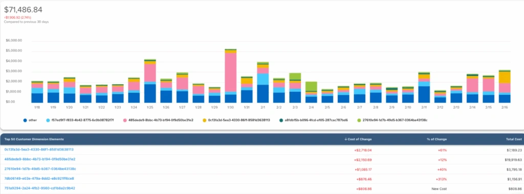 Image: Note the cost of the Billing Ingest feature, sorted by customer. Those colorized tags are Customer IDs (actual customer names are hidden for privacy).