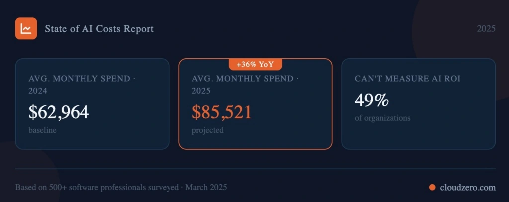 CloudZero’s State of AI Costs report found that average monthly AI spend reached $62,964 in 2024, with projections rising to $85,521 in 2025. Only 51% of organizations said they could confidently evaluate the ROI of that spend.