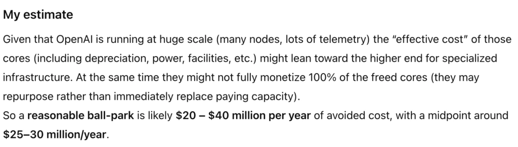 What $25M inherently means, regardless of who saves it: Better-architected systems, systems that burn substantially less fuel in achieving their goals. A car that uses 20% less fuel — gas, electricity, shampoo, or whatever your car runs on — to get from point A to point B is obviously a better car. A chatbot that costs $25M less to generate the same level of revenue is obviously a better chatbot — all the more because it lets you reinvest in innovation.