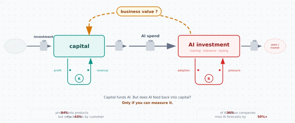 Stability. The loops are coupled. AI investment generates value that flows back into capital. You invest, measure, see returns, and adjust. The system balances. This requires granular visibility — tracking AI costs by customer, by transaction, by feature. Organizations that can do this are ahead. Most can’t.