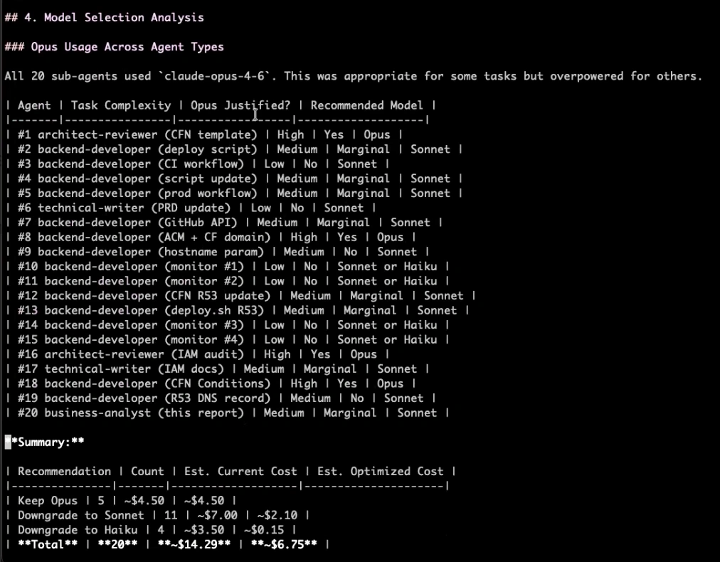 In numerous cases, I’d chosen the right model. In others, I’d chosen an unnecessarily expensive model. Claude assessed all of these and put them in a big list for me. The report even included my cost per line of code: $0.0196. Here’s the Model Selection Analysis part of Claude’s report (look at the “Opus Justified?” and “Recommended Model” columns especially):
