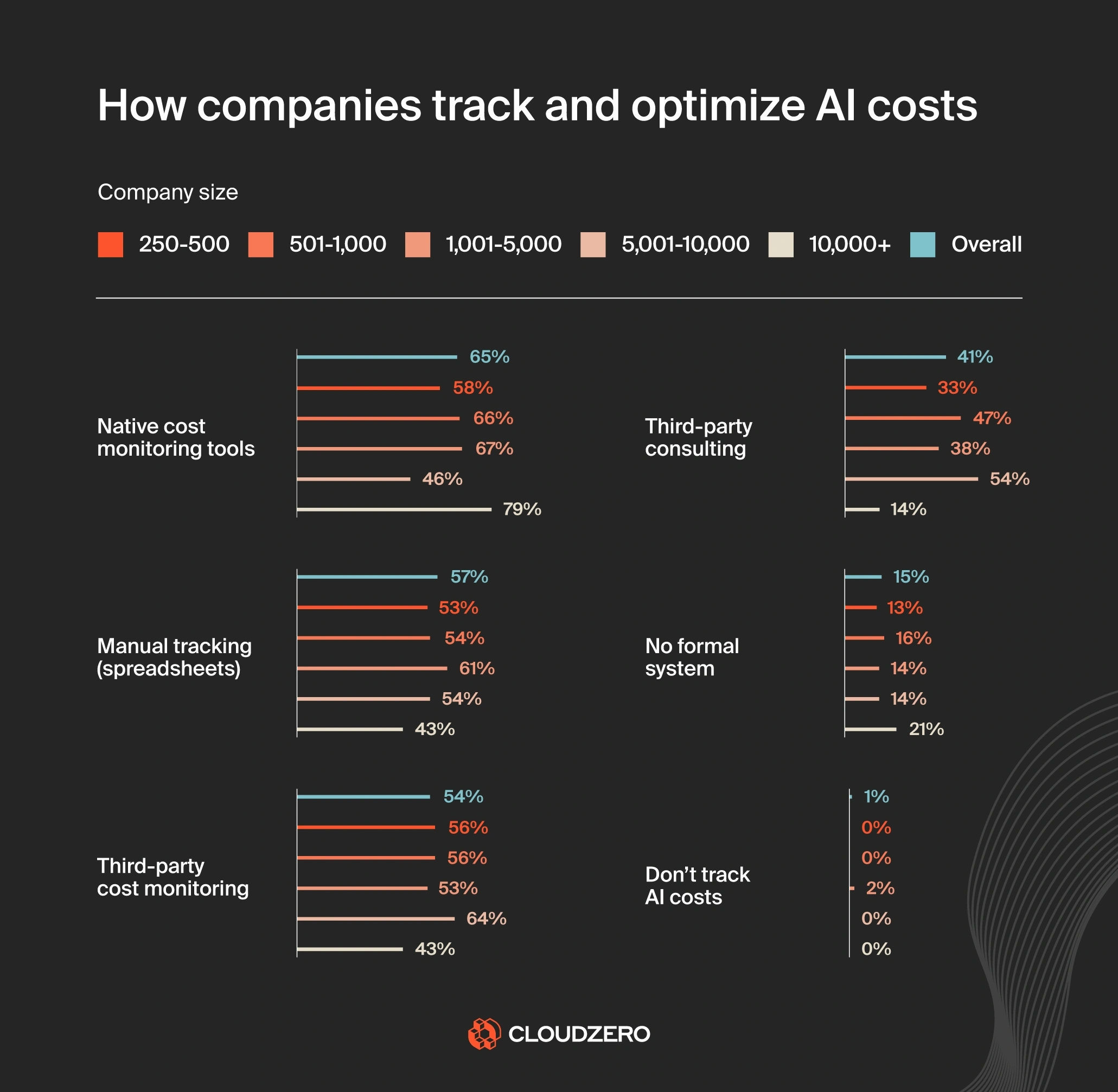 - 21% of large companies don’t have any formal cost-tracking systems in place, leaving them at risk of overspending on AI without knowing where the money is going.