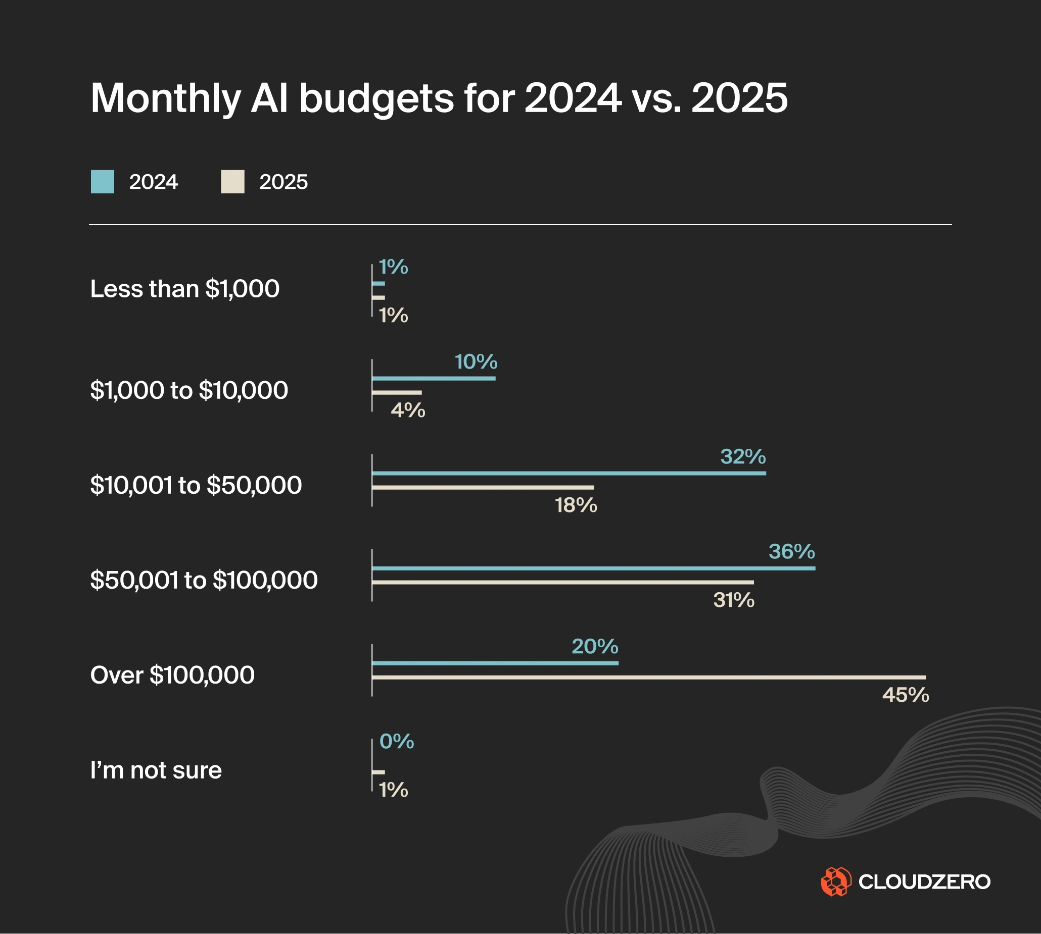- Average monthly AI budgets are expected to rise 36% in 2025, reaching $85,521 per month. This reflects a shift toward larger, more complex, mission-critical AI initiatives. You can see that shift clearly in the chart above. The share of companies spending over $100,000 per month jumps from 20% to 45%, while all smaller budget brackets shrink year over year.
